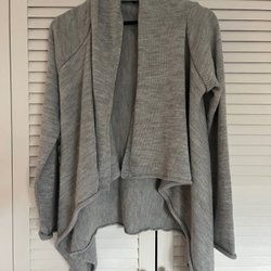 Mjuk och tunnstickad tröja med draperad framsida och trekvartsärm. Fin plommonlila färg och lätt material som faller fint. Märkt med storlek S.