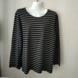 Långärmad tröja med horisontella ränder i grått och svart. I ekologisk bomull. Tröjan har en rund halsringning. I fint skick, hel, ren och fläckfri. Stl M. Bystvidd: ca 106 cm. Längd från axelns högsta höjd ca 63 cm.