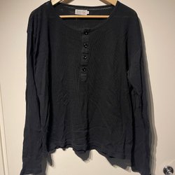 Grå stickad tröja med rund halsringning och en liten broderad logotyp på bröstet. Tröjan har ett ribbat mönster.