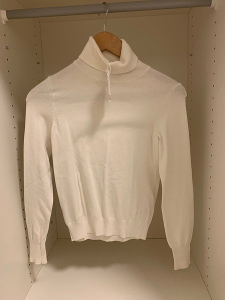 Vit, långärmad tröja med hög krage.