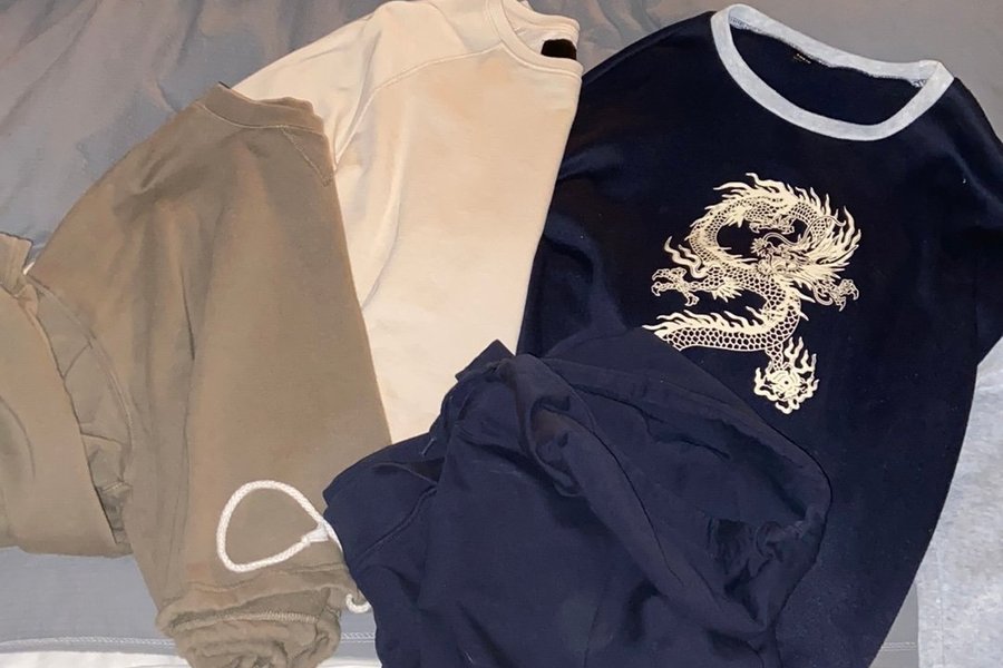 Fyra tröjor, en mörkblå hoodie i storlek L men den är mindre så skulle snarare säga att det är en M och tre collage tröjor med olika färg