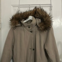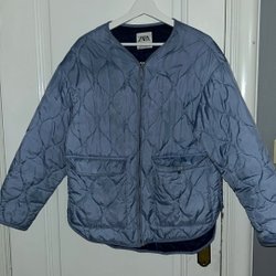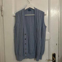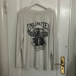 Grå stickad tröja med hög krage och långa ärmar. Storlek L men passar en M.