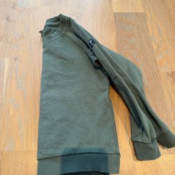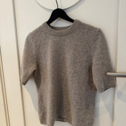 Beige stickad tröja med kort ärm och rund halsringning.