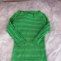 Röd stickad tröja med v-ringning och kabelstickat mönster framtill.