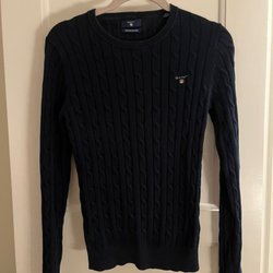 Marinblå stickad polotröja från Gant med ett emblem på bröstet. Tröjan har en vit rand vid halsen. Unisex , lammull lamm ull 80%