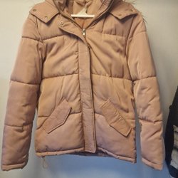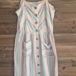 Stickad tröja i ljusgrått med rosa och mörkgrå ränder. Tröjan har en rund halsringning och långa ärmar. Passar bra till vardags.