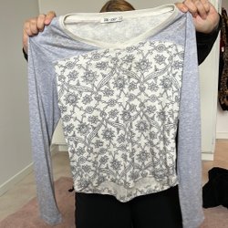 Ljusrosa tröja med trekvartsärm och spetsdetaljer vid halsen.
