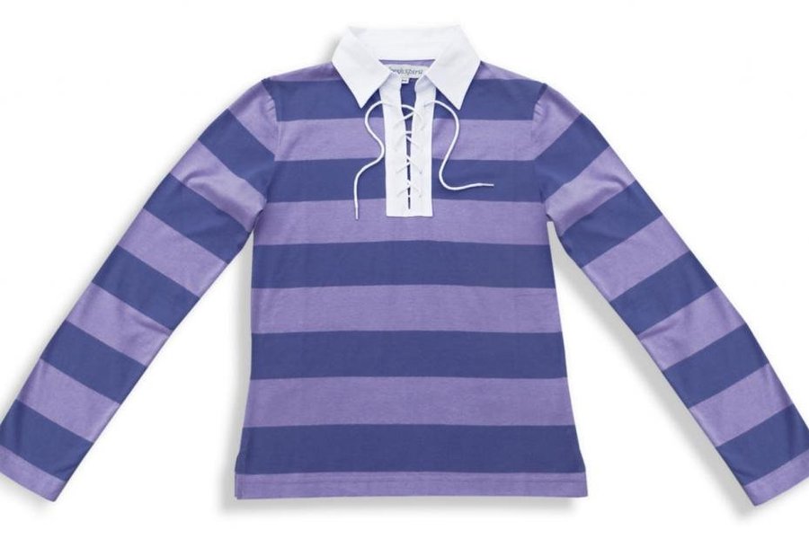 Långärmad tröja med ett randigt mönster i lila och blått. Den har en vit krage och snörning framtill.