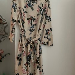 Vit tröja med ett blommigt mönster i grå toner. Tröjan har trekvartsärmar och en asymmetrisk fåll.