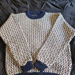 Grå stickad tröja med ett mönster runt halsen och nederkanten i blått och vitt. Tröjan har långa ärmar och en ribbstickad mudd vid ärmslut och nederkant.