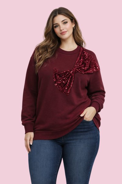 Deze trui heeft een ronde hals en lange mouwen. De voorkant is versierd met een grote, glimmende strik van pailletten in dezelfde kleur als de trui. De trui heeft een relaxte pasvorm en geribbelde boorden aan de mouwen en onderkant.