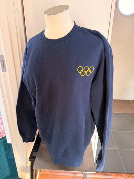 Mörkblå sweatshirt med långa ärmar och rund halsringning. Tröjan har en broderad logotyp med olympiska ringar i gult på bröstet.