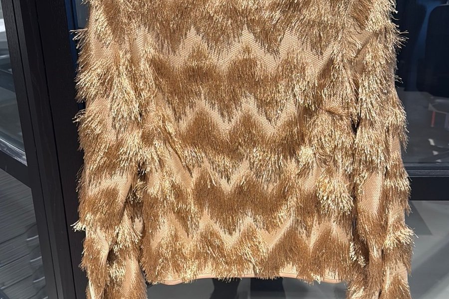 Tröja med långa ärmar och rund halsringning. Tröjan har ett unikt mönster med fransdetaljer som ger en texturerad och iögonfallande look.