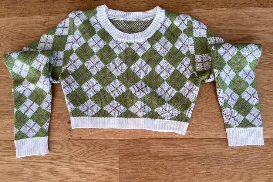 Grön och vit stickad tröja med argylemönster och långa ärmar. Tröjan har en rund halsringning med vit kant. Det är en kort modell.