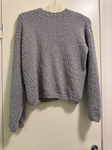 Grå stickad tröja med långa ärmar och en texturerad yta. Tröjan har en avslappnad passform och en rund halsringning.