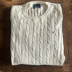 Vit tröja med långa ärmar och texten ”GANT” i rött och grått på framsidan.