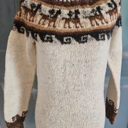 Tröja med rund halsringning och långa ärmar. Mönsterstickad över bröstet och runt ärmslut och nederkant.