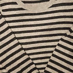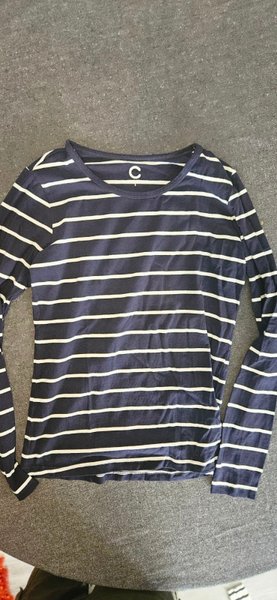 En långärmad tröja med ett randigt mönster i marinblått och vitt. Tröjan har en rund halsringning och långa ärmar.