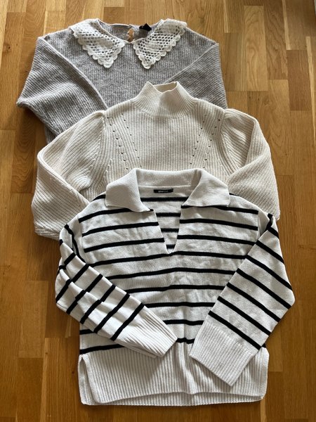 Säljer tre stickade tröjor i olika färger och stilar. Den beiga tröjan har en spetsad krage, den vita tröjan har en hög hals och den randiga tröjan är v-ringad med krage. Alla tröjor är i mycket gott skick.