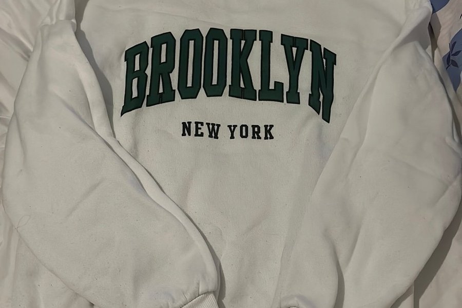 En vit sweatshirt med trycket ”BROOKLYN NEW YORK” i mörkgrönt på framsidan. Tröjan har långa ärmar med muddar vid ärmslut och nederkant.