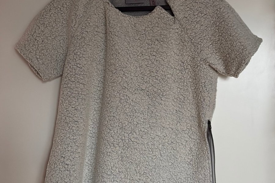 Tröja med korta ärmar och rund halsringning. Tröjan har en dragkedja längs ena sidan och en rundad nederkant.