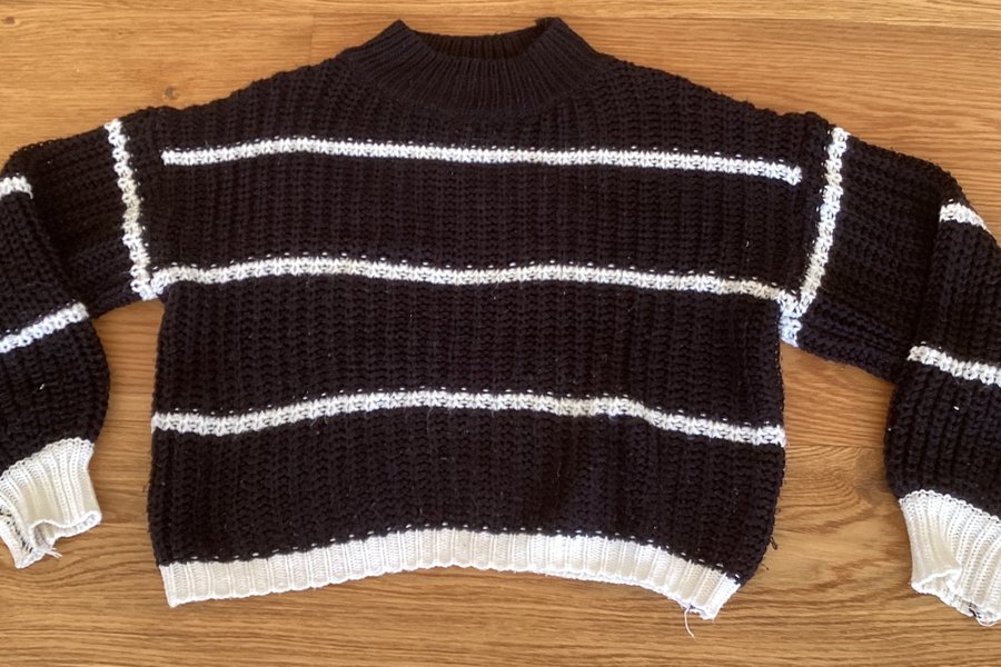 Svart stickad tröja med vita ränder och långa ärmar. Tröjan har en rund halsringning och ribbade muddar.