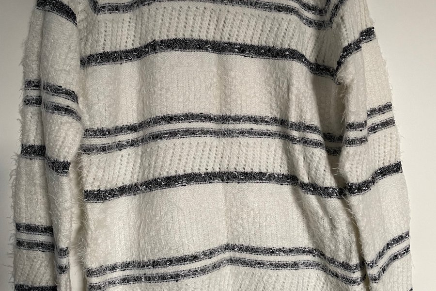 En vit tröja från Ofelia i storlek small med svarta horisontella ränder. Tröjan har en rund halsringning och långa ärmar. Den har en mjuk och något fluffig textur.