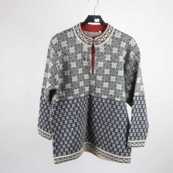 Tröja med rund halsringning och långa ärmar. Tröjan har ett mönsterstickat ok i två blå nyanser mot en ljus bottenfärg. Muddar finns vid ärmslut och nederkant. Ny oanvänd stickad av mig i mjukt skönt islandsgarn 100%ull ( Lettlopi) jag som provar tröjan på bild har 110 i bystmått.