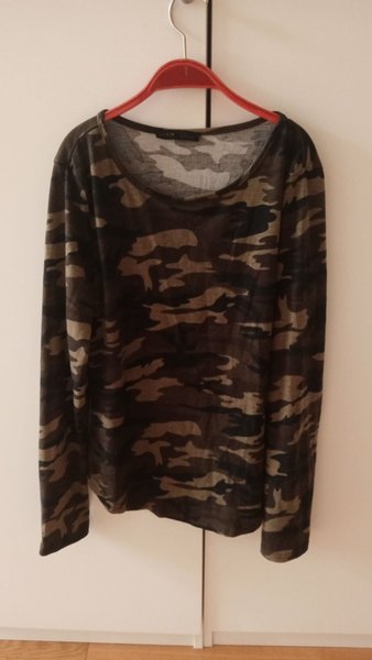 Långärmad tröja med kamouflagemönster i jordnära färger. Tröjan har en rundad halsringning och raka ärmslut. Passar bra för en avslappnad stil.