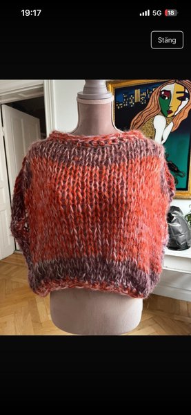 Tröja i en blandning av orange, rött och lila. Designen har en lös passform med korta ärmar och en rund halsringning. Stickningen är grov och ger plagget en luftig textur.