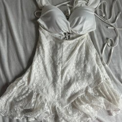 Ribbstickad tröja med hög hals och långa ärmar. Tröjan har en öppen rygg med knytband i midjan.
