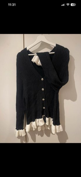 Svart kofta med ribbad struktur och vita volangdetaljer vid ärmslut och nederkant. Koftan har knappar framtill.