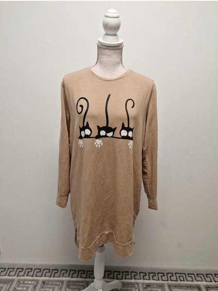 Långärmad tröja i en ljusbrun färg med ett tryck av tre svarta katter på framsidan. Tröjan har en rund halsringning och en avslappnad passform.