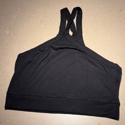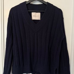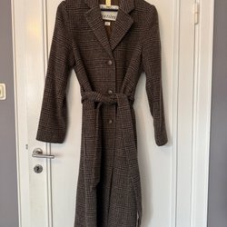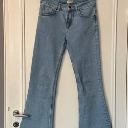 Indigoblått set i 100% lin med kraglös skjorta och vid rak byxa från Arket. Strl 36 men känns mer generös.