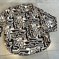 Svart och vit mönstrad skjorta med trekvartsärm. Skjortan har en krage och knappar framtill.