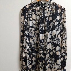 Rutig blus med lång ärm och volangdetaljer runt halsringningen och knappslå. Blusen har knappar framtill.