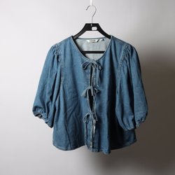 Blå denimskjorta med långa ärmar, krage och snörning framtill. Skjortan har två bröstfickor med knapp.