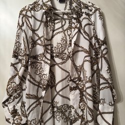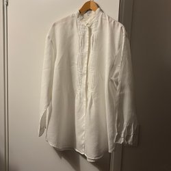Vit skjorta med långa ärmar och knappar framtill. Den har en dragsko i nederkant för justerbar passform.