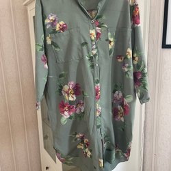 Skjorta med lång ärm och krage. Mönstrad med blommor i olika färger. Knäppning framtill med knappar.