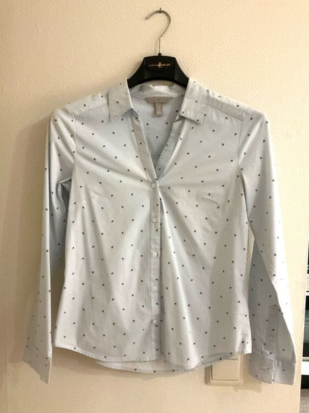 H&M Brand A lightweight blouse with long sleeves and a pattern of small black birds. The blouse has a V-neck and button closure.