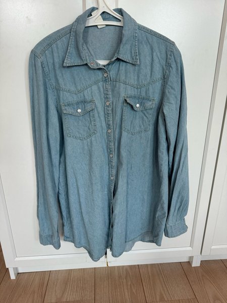 En ljusblå skjorta med långa ärmar och knappar framtill. Den har två fickor på bröstet. Storlek M, ifrån Gina tricot.