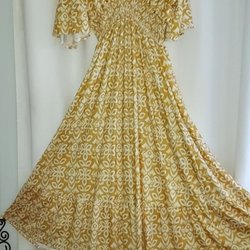 Klänning/storskjorta med långa ärmar och ett mönster av vita blad på en mörkblå bakgrund. Klänningen har en v-ringning med knappar hela vägen framtill och en lös passform. Fin som tunika/klänning/tunn kofta...