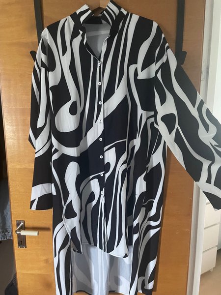 Svart och vit mönstrad skjortklänning med knappar framtill och långa ärmar. Klänningen har en längre baksida.