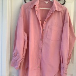 En rosa skjorta med långa ärmar och knappar framtill. Skjortan har en rundad nederkant och en klassisk krage.