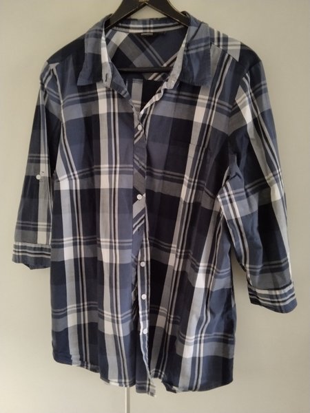 Rutig skjorta med krage och knappar framtill. Ärmarna kan fästas upp med en knapp och slejf.bomull