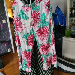 Eleganta röda byxor med hög midja och vida ben. Byxorna har ett matchande band som knyts i midjan. Storlek L men har sytts upp och passar nu mer ett M.