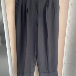 Ett par svarta byxor med hög midja och en dragkedja baktill. Byxorna har en smickrande silhuett med rynkade detaljer längs benen. Sitter väldigt fint på