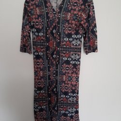 Ett par mönstrade 5-ficks byxor med ett paisley-liknande tryck i en kombination av beige, brunt och en hint av korall. Linning med hällor, knäppes med 10 cm blixtlås och knapp.