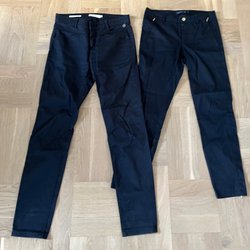 Snygga svarta byxor i skinnlook. Byxorna har en rak passform. Mycket sparsamt använda. Dragkedja och knapp i midjan.