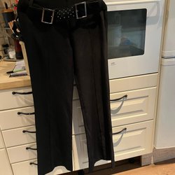Eleganta svarta byxor med dekorativt bälte i midjan. Bältet går att ta bort. Sidfickor och fuskfickor bak. Resår mitt bak i linningen. Byxorna har en smickrande passform och är perfekta för både vardag och fest. Från djur o rökfritt hem.
